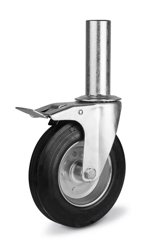 Zestaw kołowy obrotowy z hamulcem, model CKLW-SG 200W(35/45)-HC, przeznaczony do profesjonalnych zastosowań w mobilnych konstrukcjach rusztowaniowych. Wersja ta została wyposażona w solidny hamulec, który blokuje zarówno obrót koła, jak i skręt obudowy, gwarantując pewne unieruchomienie i bezpieczeństwo rusztowania. Konstrukcja oparta na obudowie z tłoczonej blachy stalowej zapewnia wysoką wytrzymałość, a koło z pełną oponą gumową gwarantuje cichą pracę i ochronę podłoża. Koło o średnicy 200 mm i szerokości bieżni 27 mm osadzone jest na wytrzymałym łożysku wałeczkowym, co zapewnia płynność obrotu. Maksymalna nośność zestawu wynosi 230 kg, przy całkowitej wysokości 370 mm. Montaż odbywa się za pomocą trzpienia o średnicy 32 mm.